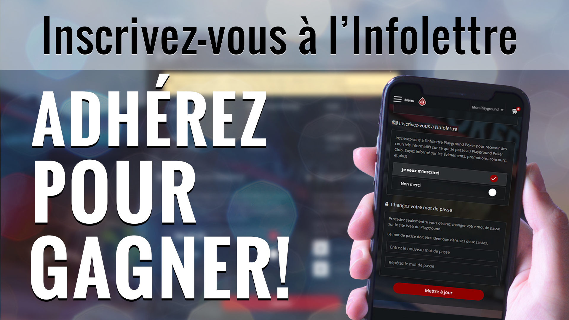 L’Infolettre est une excellente façon de rester informé sur tout ce qui concerne le Playground. C’est un simple courriel contenant de l’information sur les promotions en cours et à venir, les évènements, et plus. Playground Poker Club aimerait que vous y adhériez, et a décidé de vous en donner la motivation! À partir de maintenant, tous ceux faisant partie de notre liste de destinataires participent automatiquement à un concours qui décernera des prix chaque mois: 4 tickets de Satellite PP LIVE Dollars à 22$ 1 ticket de Satellite PP LIVE Dollars à 530$ Ces satellites décernent des PP LIVE Dollars, qui peuvent être utilisés pour vous inscrire à n’importe quel tournoi Playground. Pour une liste complète de ce que cette monnaie peut vous apporter, cliquez ici. Vous pouvez vous y inscrire vous-même sur notre site Web en vous connectant et en cliquant sur Mon Playground dans le coin supérieur droit […]