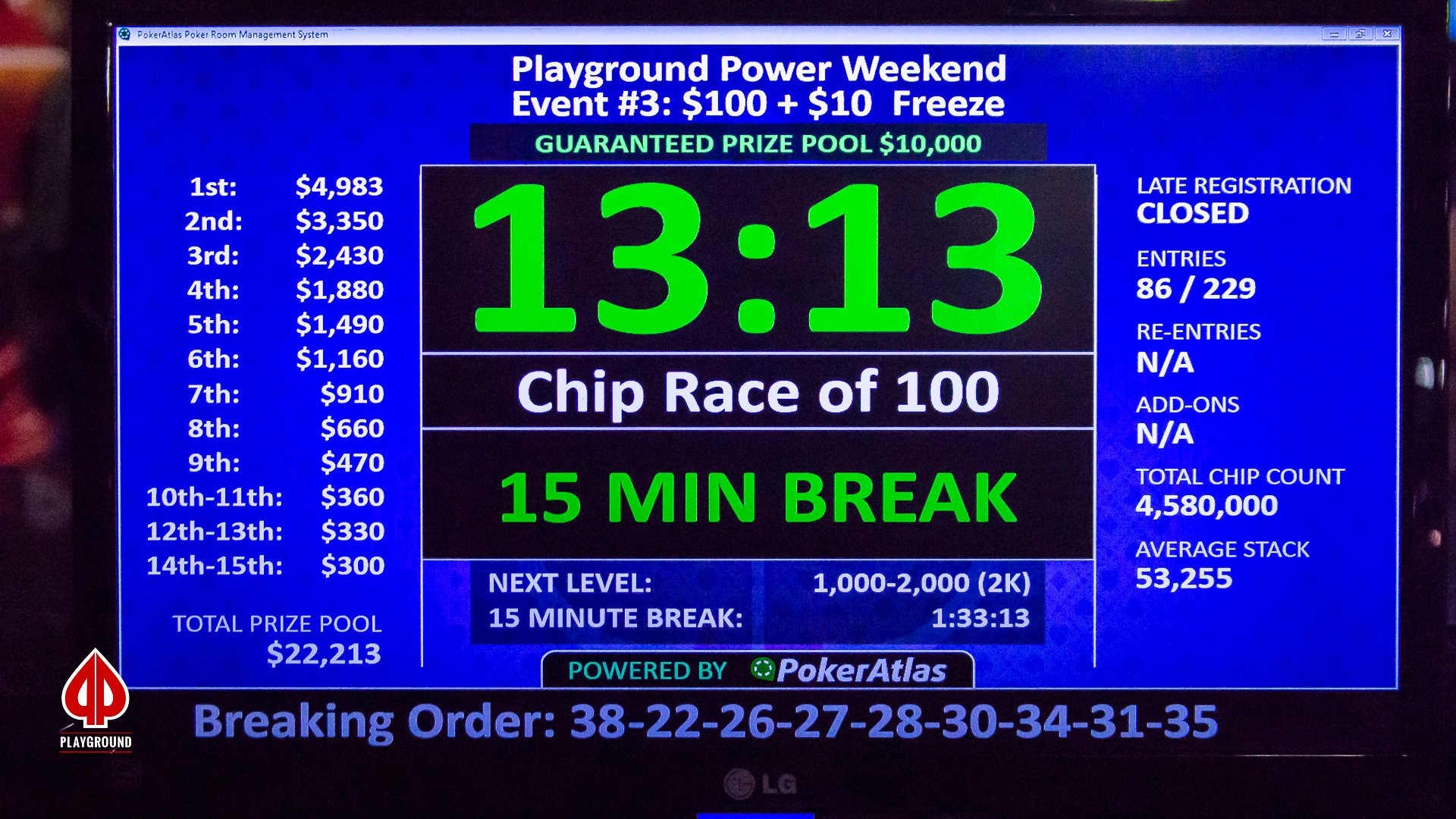 Event #3, $100 + $10 Freeze, started at 7:00pm and boasted a $10,000 guaranteed prize pool. With a total of 229 entries, the prize pool grew to $22,213, with $4,983 to be paid up top to the event champion, and a min-cash of $160 for 29th place.